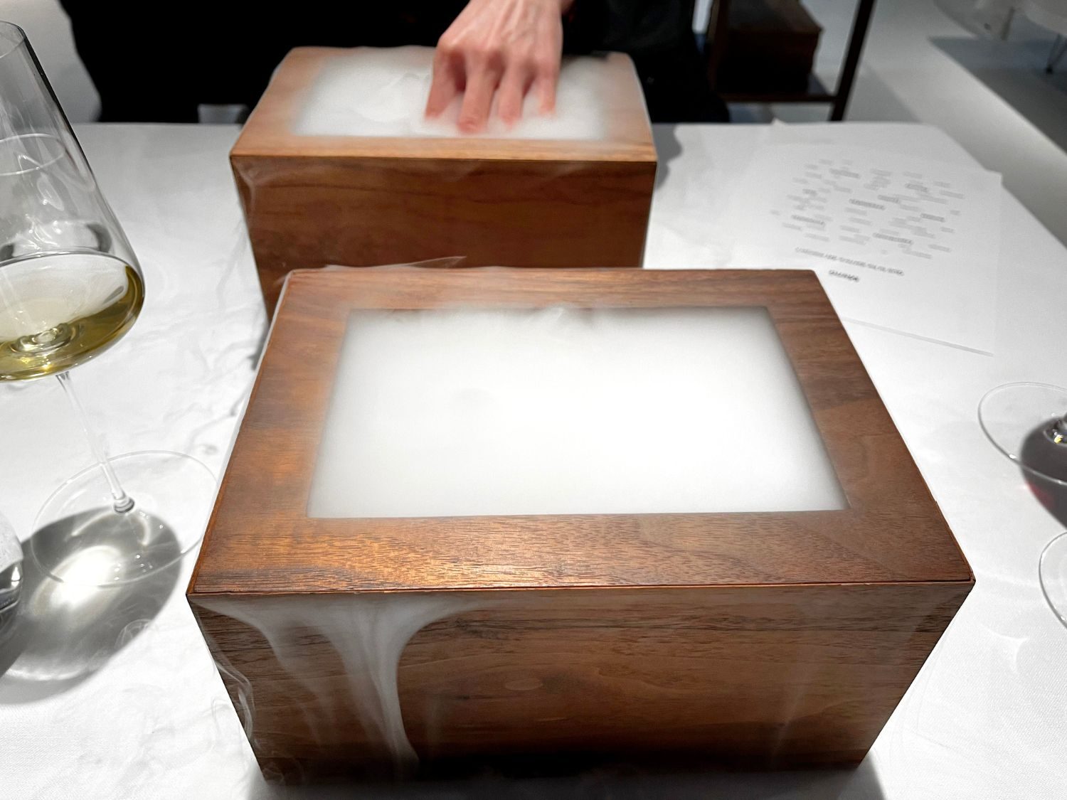 The “Viva” Table or Table M#01 at Disfrutar, introduced in 2021 or 2022, is a concept designed for a maximum of six people. Situated in the restaurant’s R&D kitchen (on the -1 level) and crafted by Merche Alcalà, this table is equipped with 48 boxes containing surprises revealed using magnets in a synchronized manner, all while classical music plays. The result is a spectacle that blends aesthetic and emotional beauty. This unique table promises a “completely new and different experience,” inviting diners to engage with the gastronomic journey by interacting with the table.